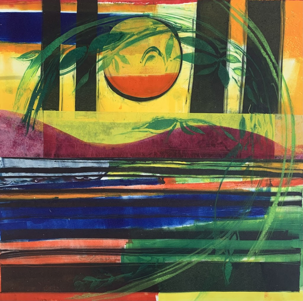 Landscape and memory are starting points for prints, in which I use very direct processes to record ideas. I have walked on The Dyke Hills and the Wittenham Clumps for many years and it is still exciting to catch glimpses of these monumental places as I travel in this part of Oxfordshire.